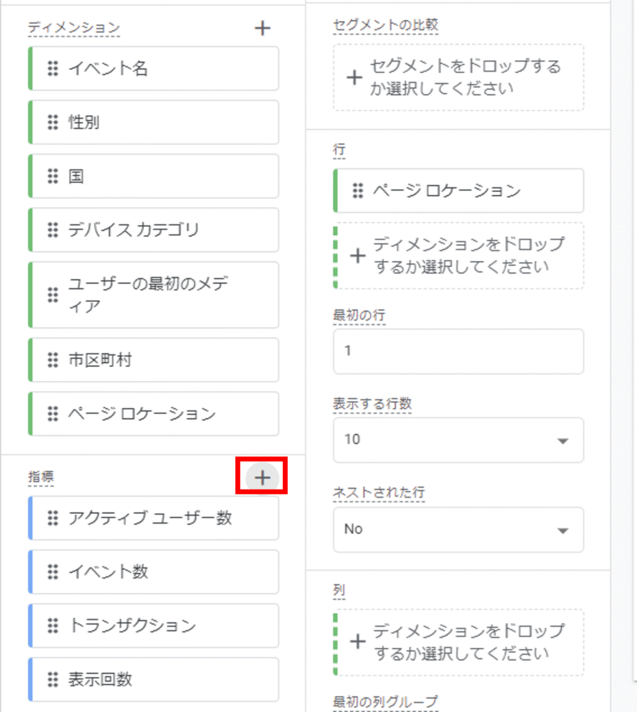 指標近くにある「+」を選択し、先ほど同様「表示回数」をインポートします。