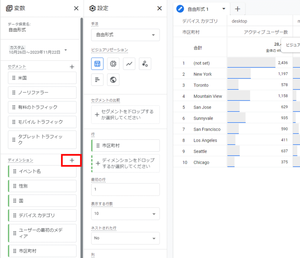 レポート作成後は、ディメンションの近くにある「+」を選択し、レポートに追加するディメンションを選択します。